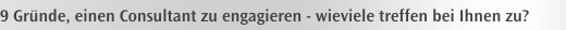 □ Kernkompetenzen ergänzen oder weiterentwickeln □ Zusätzliche Methodenkompetenz zeitweilig verfügbar machen □ Zusätzliche Kapazität auf Zeit aufbauen □ Planungs- und Entscheidungsunterstützung für das Management bereitstellen □ Die Organisation im Wandel begleiten □ Neue Führungsaufgaben einrichten und vorläufig wahrnehmen □ Branchen-internen oder –externen Überblick einbringen □ Konflikt-Themen aus dem internen Team heraushalten □ Neutrale Lösung Team-interner Konflikte herbeiführen